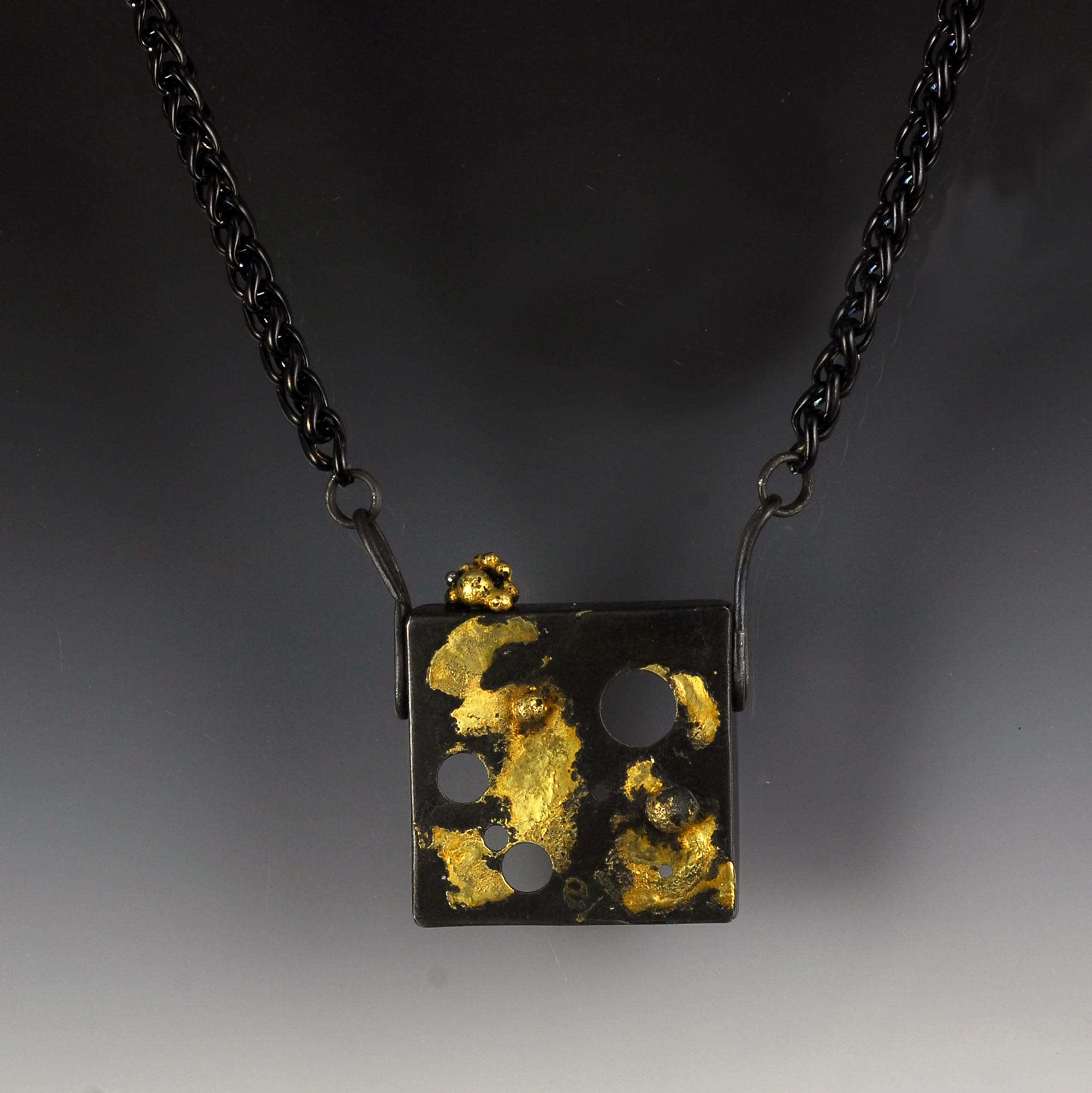 This dimensional steel square pendant glows with fused 18k yellow gold. The pendant has been, pierced with circle openings and features steel ball bearings also fused with gold. Suspended from a bold steel black chain.
