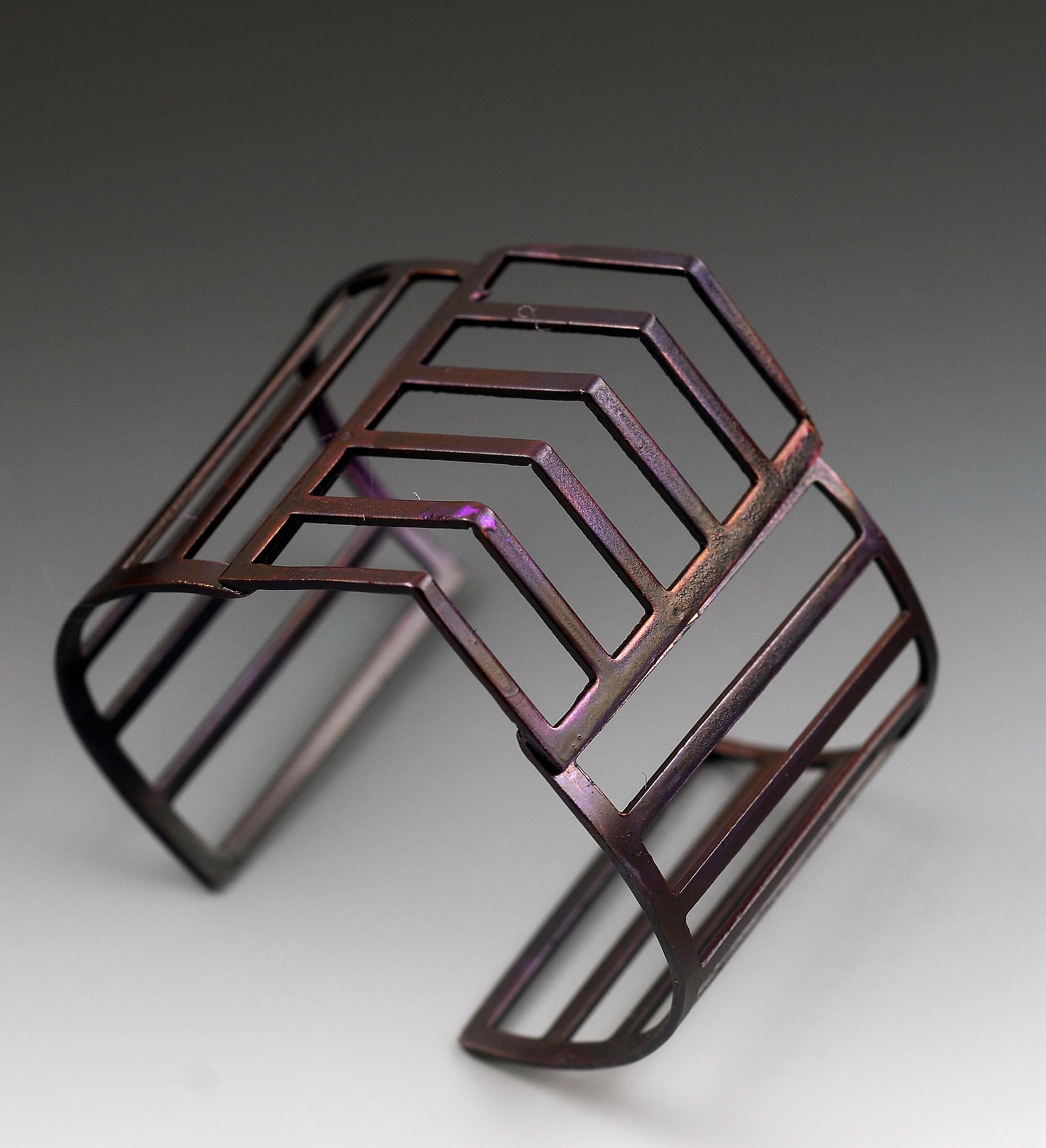 Lightweight, dramatic and comfortable, this angular perforated steel cuff has been patinated with a slightly purple tint over black. Incredible light and easy to wear.
